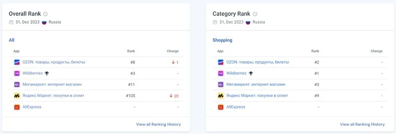 Оценить трафик мобильных приложений мне не позволил тариф Similarweb. Приведу вам данные по скачиванию мобильной версии. Здесь лидирует Wildberries. Ozon уступает лишь одну позицию в категории Приложения для онлайн продаж. В Общем рейтинге приложение Wildberries занимает 3 место, а Ozon 8 место.